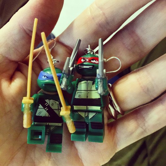His mood has been low but who can blame the poor little fellow! We have tried to tempt him with sweets and my friend Lisa gave me some Teenage Mutant Ninja Turtle earrings to wear to see if that might cheer him up.  So far no smiles. Yet! Might be hard to tell but I’m modelling the Leo and Raf turtles in the photo below!