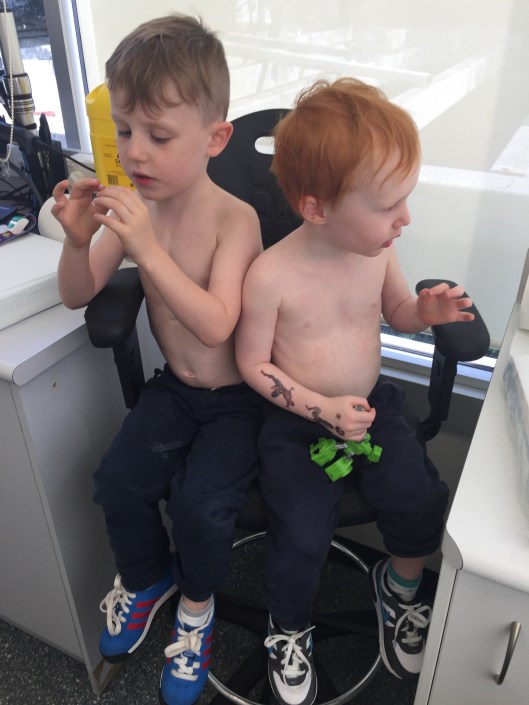 I set Ted up with it and he settled after a minute and I realised he wasn’t wheezing at all. It wasn’t asthma. I had a look at his throat thinking maybe he’d had a bleed or something. The scab looked OK. Good even.